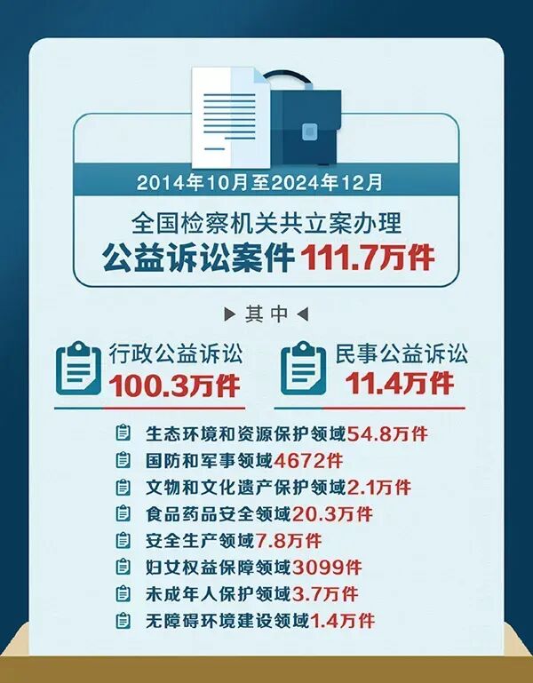 近年来,检察机关全面贯彻习近平法治思想,忠实履行宪法法律赋予的法律监督职责,把公益诉讼检察与刑事检察、民事检察、行政检察并列为“四大检察”统筹推进,取得积极成效。2014年10月至2024年12月,检察机关共立案办理公益诉讼111.7万件,其中行政公益诉讼100.3万件,民事公益诉讼11.4万件,有效促进完善公共利益长效保护机制。